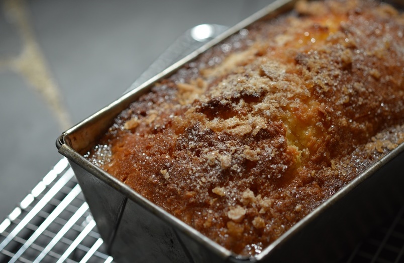 Simple as that, just pour it into the pan and bake for approx 50 minutes. You’ll know when it’s ready as a skewer will come out clean. While the cakes baking, add the lemon juice and sugar to a small pan and cook over a low heat to dissolve the sugar stirring as you do so. Increase the heat and cook for about 5 minutes until slightly reduced. When the cakes out and still warm in its pan prick along the top with a skewer and pour over the syrup. Crush over the sugar cubes and add a sprinkling of caster sugar (or whatever sugar you fancy) and this will dry and add a delightful crunch. Be careful taking the cake out its pan, I usually use a tea towel very gently so the sugar doesn’t all fall off.