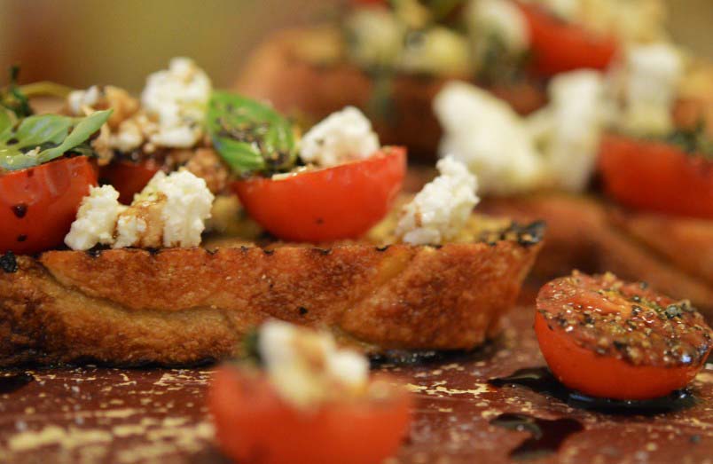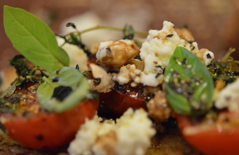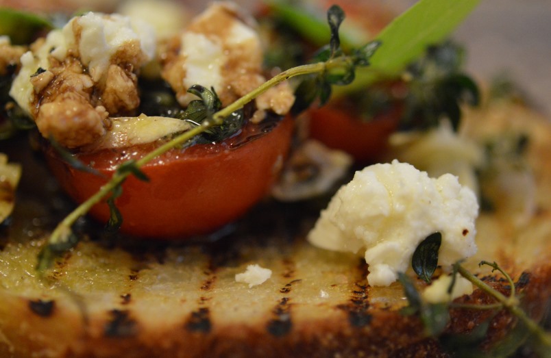 We used ‘Meredith Dairy’ goat cheese, which had been marinated in extra virgin olive oil, garlic and thyme. Toasting the bread on a griddle pan adds a nice charcoal punch, cutting through the acidity of the tomatoes and balsamic.