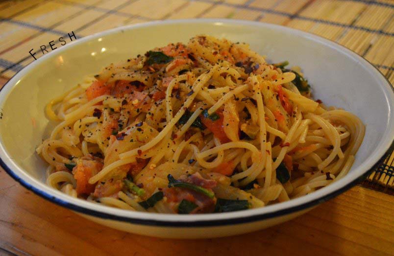 Peel the tomatoes and chop them before adding to the frying pan, adding pepper (the pancetta and salted spaghetti should be enough salt) and simmering whilst you bring a large pan of salted water to the boil and add the spaghetti. By the time the spaghetti is cooked, the sauce should be reduced to the right consistency so add the basil leaves and drain the spaghetti before tossing it in with the sauce and serving.