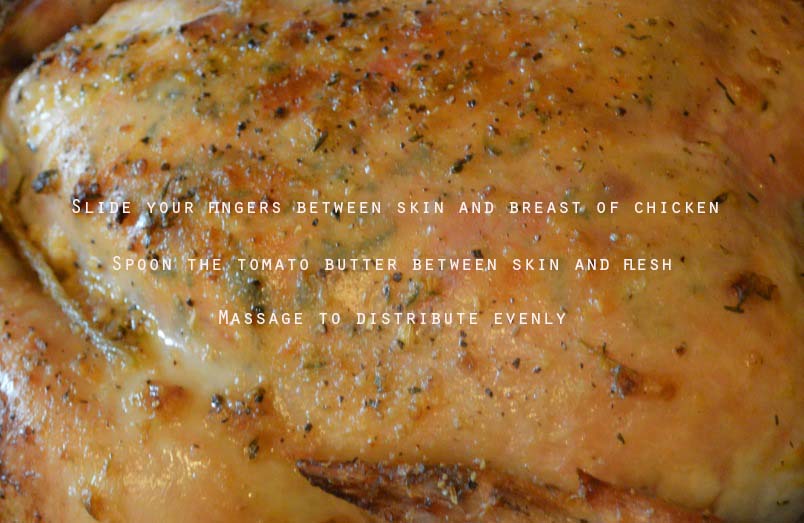 Preheat oven to 200°C, rinse chicken and pat dry with absorbent paper. Very carefully, slide your fingers between the skin and breast of the chicken to separate it. Loosen as much skin around the leg as possible making sure not to pierce the skin. If you do, it’s not the end of the world, you’ll just have to work with what you have. Spoon two thirds of the tomato butter between the skin and flesh and massage to spread it evenly. Spread the last third of the tomato butter over the chicken breast and thighs.