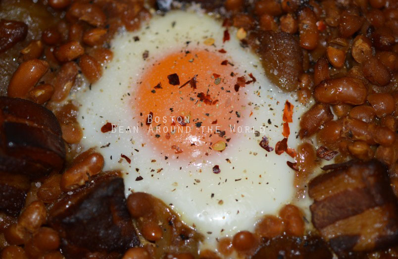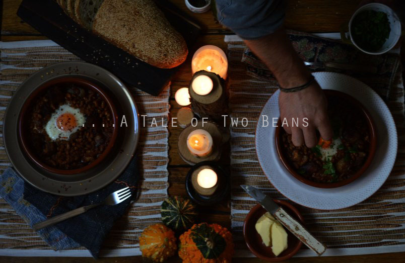 Back home to the beans, which by that time had darkened and reached the perfect consistency. I filled two terracotta bowls and made a well in the middle before cracking in the egg and cooked them slowly until the yolk still wobbled and the whites had set.
