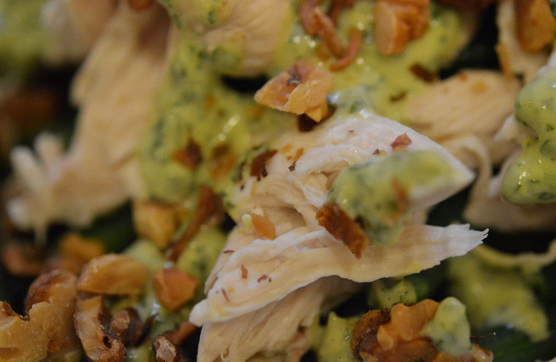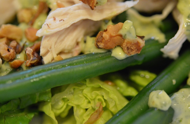 Blanch the beans in the boiling water for about 2 minutes and refresh in the cold water. Drain well and add to a large bowl with the salad leaves and watercress. Coarsely shred cooled chicken and coarsely chop walnuts and add them to the salad.