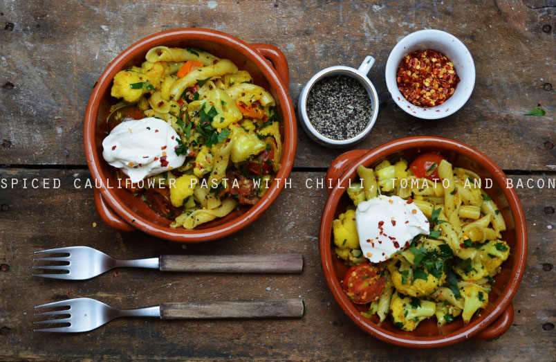 Now add the bacon to the shallots/spices and fry for a few minutes before adding the cauliflower and more oil, if it’s looking a bit dry. Give it a pinch of salt.
