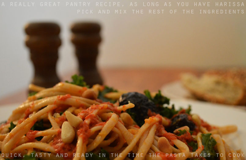 Drain pasta and leave in a colander whilst you heat up ¾ of your harissa oil in the pasta pan with the kale then tip the pasta back in, stir to coat and spinkle in the toasted pine nuts and olives.