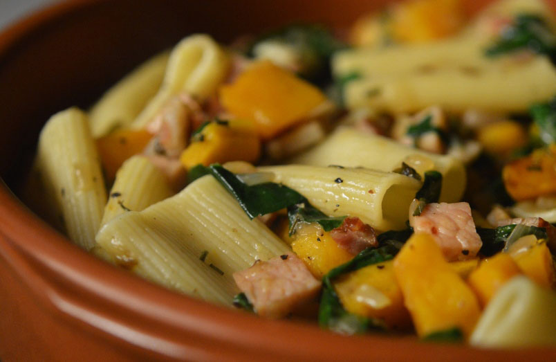 Pasta with Roast Pumpkin, Rosemary, Smoky Bacon and Spinach
