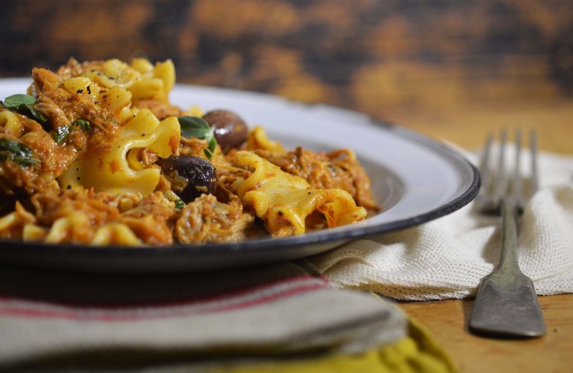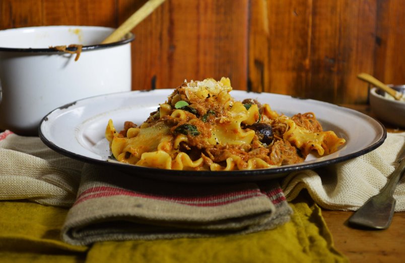 I’ve made this ragu so many times since I first tried it, about 2 years ago. Its simplicity always deems it a pleasure to make and it’s perfect for a dinner party, as it can feed 6-8. If you have fiddly starters or desserts, this can just be left either in the oven or on the stove until the meat is ready to be lifted out, shredded and returned to the sauce – pretty dandy.