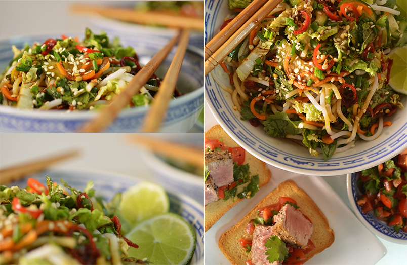 Spicy Noodle Salad with Tuna Toasties & Tobasco Tomatoes