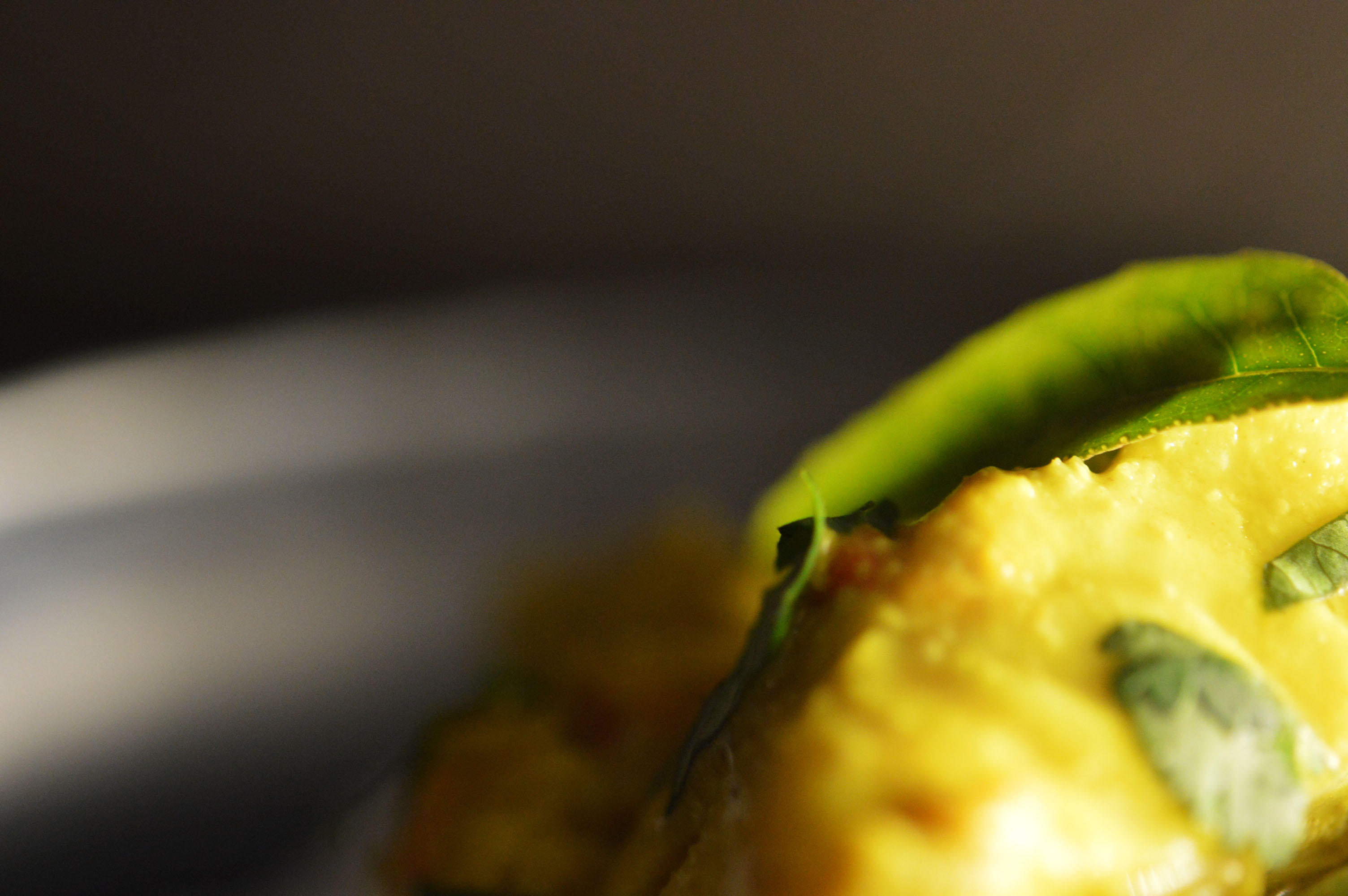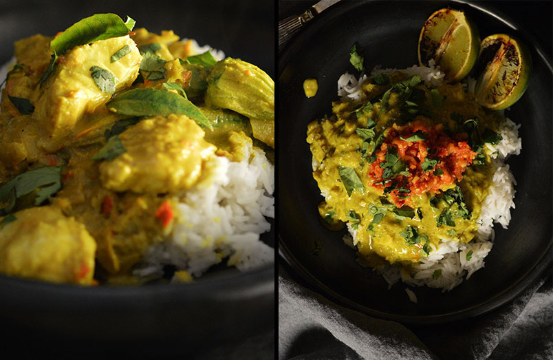 Add your fish in the last 4 minutes of cooking and serve the sauce over rice, scattered with coriander and deep fried curry leaves.