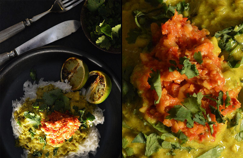 The recipe was from a ‘Delicious’ magazine, and I made the chutney using leftover tomato pulp, loads of garlic, fresh red chilli, cider vinegar and salt. Having this fresh garlicky, tangy chutney really compliments and cuts through the rich coconut sauce. Substitute the fish for prawns, any kind of meat or just stick to veggies and tofu….it’s pretty adaptable.