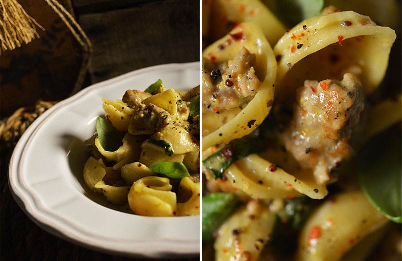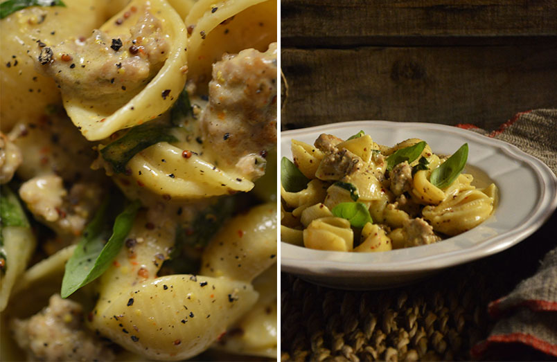 I like to use conchiglie with this dish because it captures the sauce in grooves and inside the shells, sometimes hiding a morsel of sausage too! The sauce literally just coats the pasta, so if you like things more ‘saucy’ add more wine and cream.