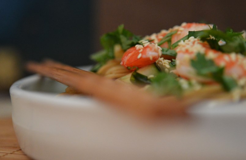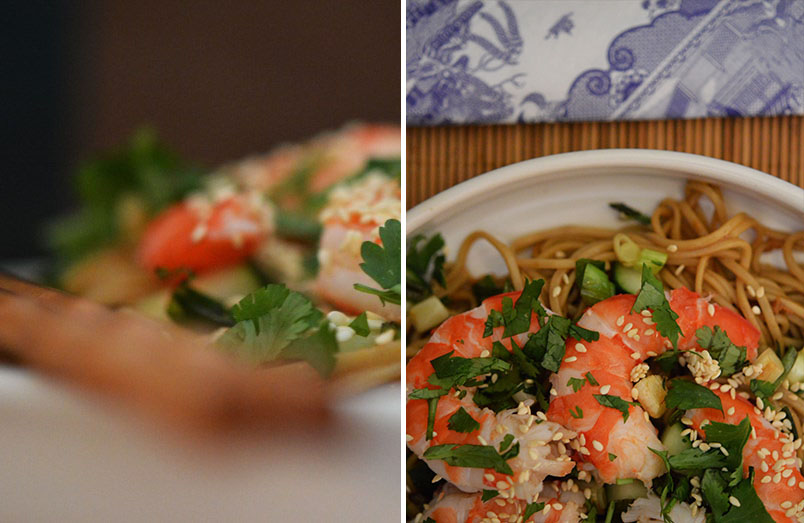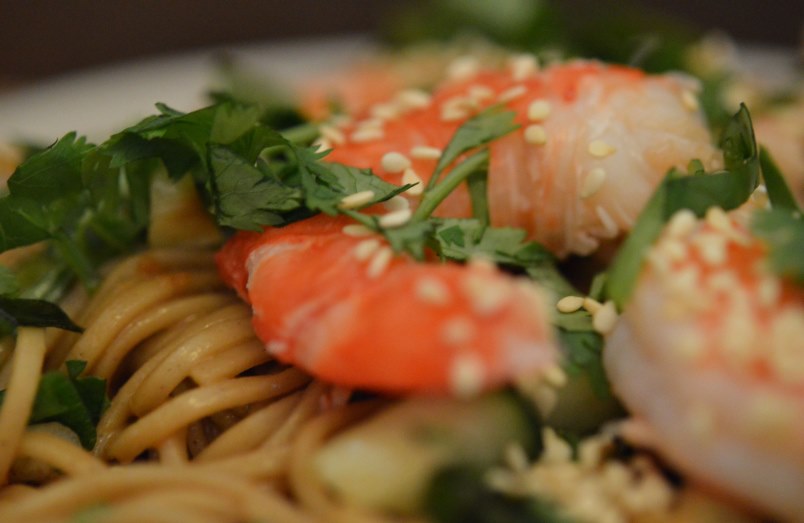 Method First chop cucumber, spring onions and coriander so ready to use. Toast your sesame seeds also ready to garnish and prepare prawns. Cook noodles according to packet instructions, drain and immerse in icy cold water.