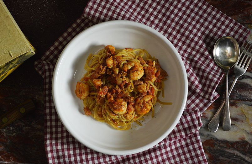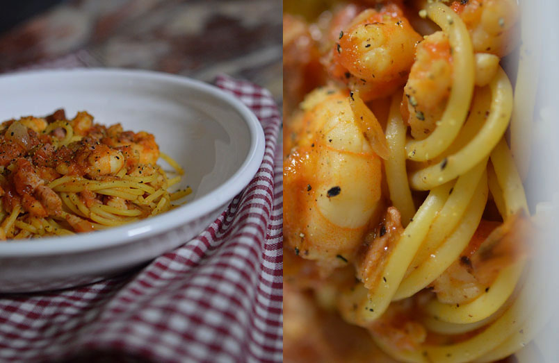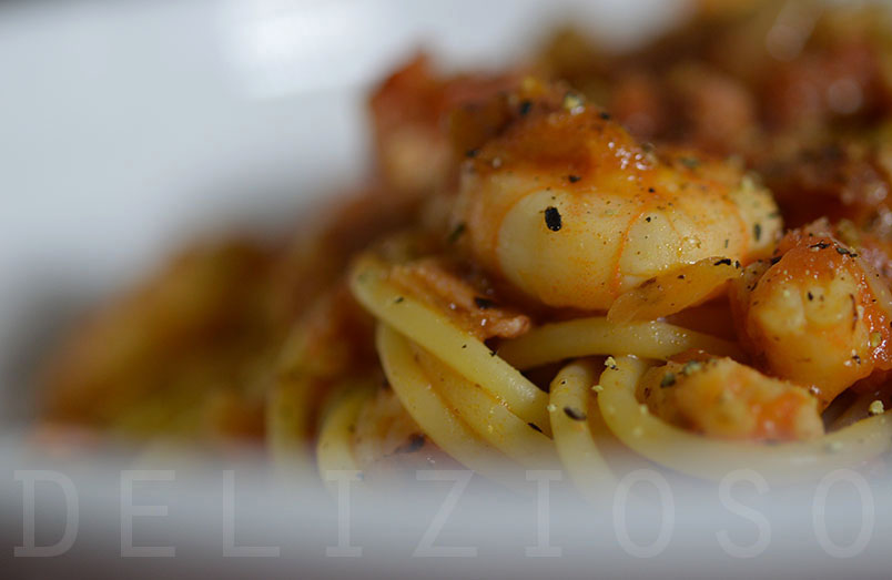 Another recipe taken from Sandra’s kitchen (La Cucina di sandra). Ben found it on her new blog, subtly emailed it to me and since then we’ve already made it 3 or 4 times. In the blog she shares travel adventures and recipes that would normally be kept for the pleasure of her guests in her Melbourne based cooking classes. Sandra calls the sauce ‘Spaghetti con gamberi e pepe nero stile Amatriciana’, click on link to view Sandra’s blog…