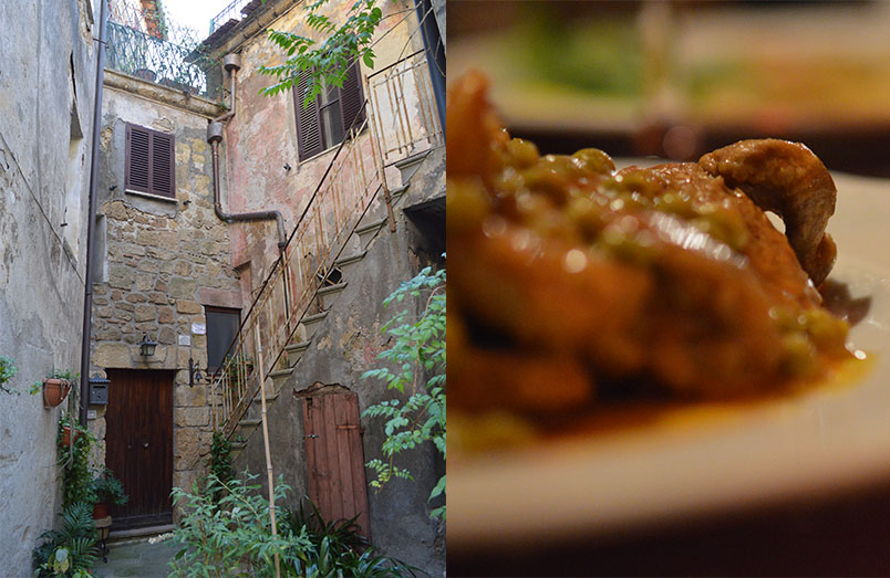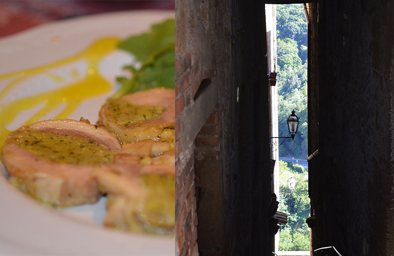 Rolled chicken stuffed with rocket and view from Pitigliano