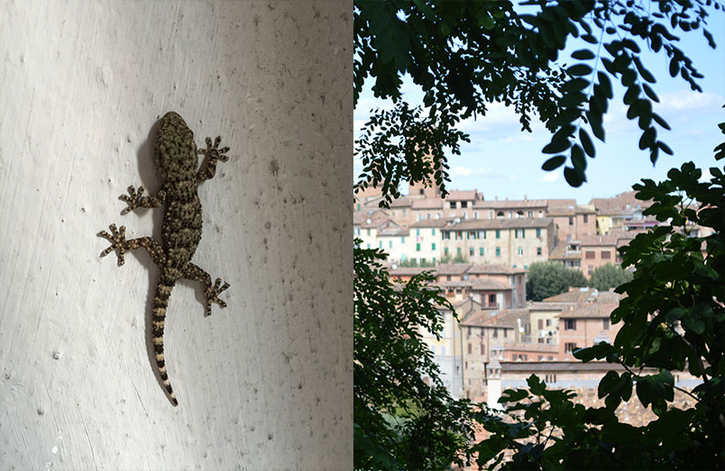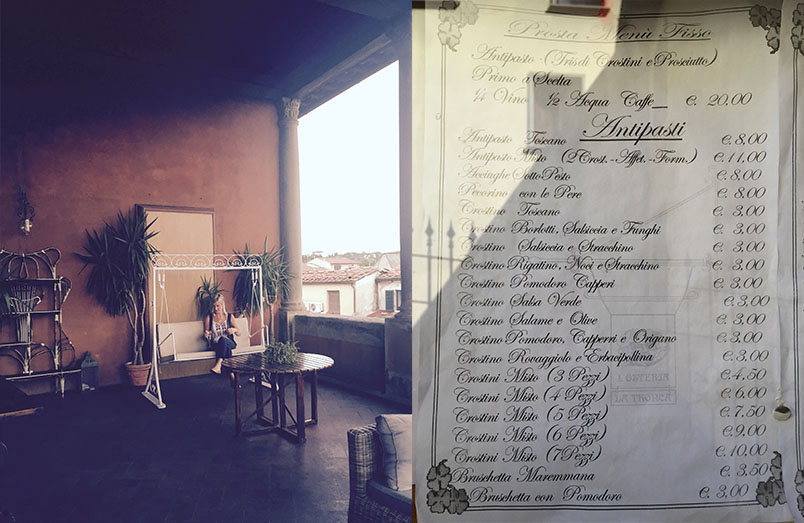 Some good ideas for toppings on white pizzas – our takeaway from Sassofortino and view from hotel in Florence