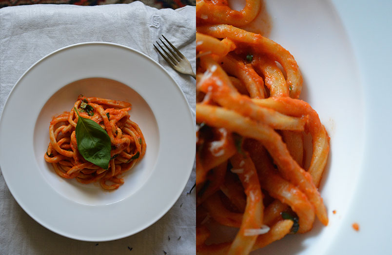 Add the smooth sauce to a pan that has a lid, leaving only a small gap for steam to escape and add a good pinch of salt to taste and sugar if you feel it needs sweetening up a little. Cook down on a low-medium heat until your sauce is thick and unctuous. Taste the sauce, check the seasoning and use it to dress your fresh pici – voila!